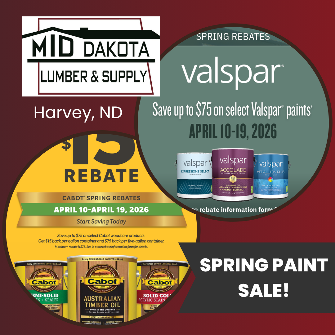 Mid-Dakota Lumber & Supply in Harvey is excited to offer our Colorful Spring Rebates on trusted Valspar Paint and Cabot Stains, running from April 10th to 17th, helping you achieve beautiful results for less. Ready to transform your home and save money this spring? Click here to visit our rebates page for complete details, product information, and to discover how Mid-Dakota Lumber & Supply can help you make the most of your home improvement endeavors!